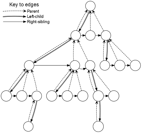 We used a left-child right-sibling representation for the tree. Each node has pointers to three other nodes: its parent, its first child, and its next sibling. The children of a node thus form a singly-linked list. For comparison, a node in our Python implementation stores a reference to its parent and a list of references to its children. This tree representation is illustrated in the following figure: