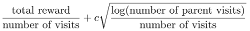 The first term is simply the average reward from all simulations through this node, which takes care of exploitation. The second term is large if the number of visits to the node is small relative to the number of visits to the parent, i.e. if the node is under-explored. The constant c allows the balance between exploitation and exploration to be tuned; if the simulation rewards are between 0 and 1, a value of c = 0.7 usually works well.